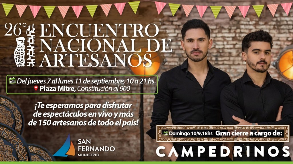 Del jueves 7 hasta el lunes 11 de septiembre, de 10 a 21 horas en la céntrica Plaza Mitre de San Fernando, se realizará el 26° Encuentro Nacional de Artesanos, con stands en los que se mostrarán las mejores artesanías del país, además de espectáculos culturales para toda la familia.