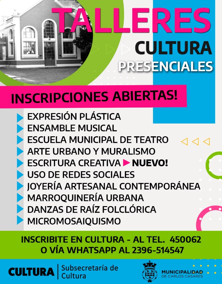 La Subsecretaría de Cultura, a cargo de la Lic. Vanina González, acaba de reabrir las inscripciones de talleres de formación que iniciarán sus clases el próximo lunes 2 de agosto, los cuales se llevarán delante de forma presencial tanto en la Casa de la Cultura ubicada en C. Borja y Dorrego como en el Espacio de Arte Municipal, frente a la Plaza San Martín.