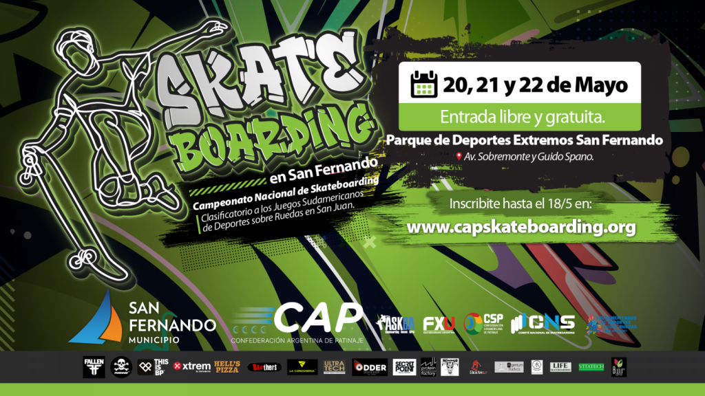 Está abierta la inscripción en las categorías Street y Park en la página web www.capskateboarding.org hasta el miércoles 18 de mayo inclusive. Para más información, comunicarse a [email protected]. La clasificatoria se realizará los días 20, 21 y 22 de mayo desde las 11 hs. en el Parque Municipal de Deportes Extremos (Av. Sobremonte y Guido Spano – Virreyes) con entrada libre y gratuita. Se invita a vecinas y vecinos a participar.