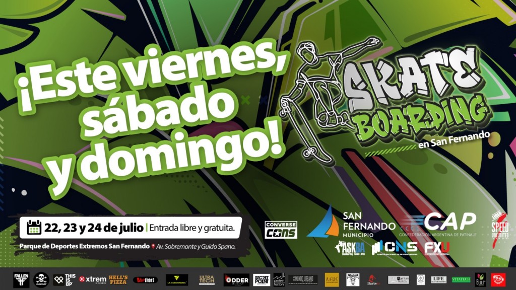 Este fin de semana llega a San Fernando el Campeonato Nacional de Skateboarding, que se llevará adelante en el Parque Municipal de Deportes Extremos ubicado en Av. Sobremonte y Guido Spano, Virreyes. En un evento organizado por el Municipio de San Fernando junto con el Comité Nacional de Skateboarding, la Confederación Argentina de Patinaje, y marcas patrocinadoras.