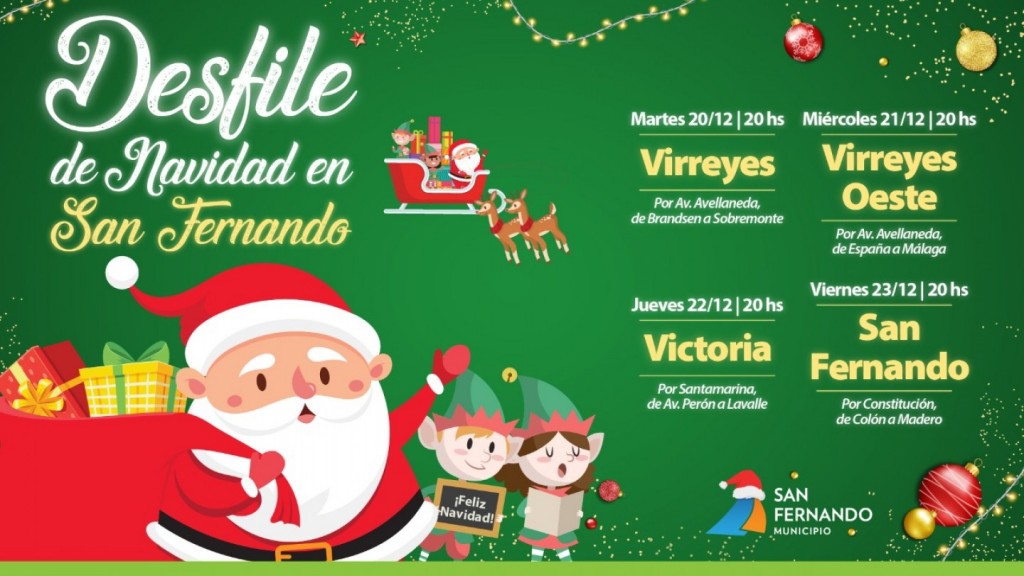 - Viernes 23/12 en San Fernando: Fotos con Papá Noel en la Plaza Mitre, Madero y Constitución. Y a partir de las 20h, el Desfile de Navidad por Constitución, de Colón a Madero.