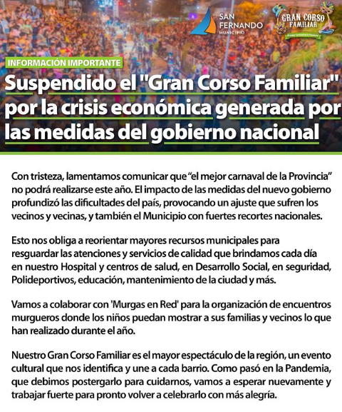 La municipalidad de San fernando informó que: Con tristeza, lamentamos comunicar que “el mejor carnaval de la Provincia” no podrá realizarse este año. El impacto de las medidas del nuevo gobierno profundizó las dificultades del país, provocando un ajuste que sufren los vecinos y vecinas, y también el Municipio con fuertes recortes nacionales.