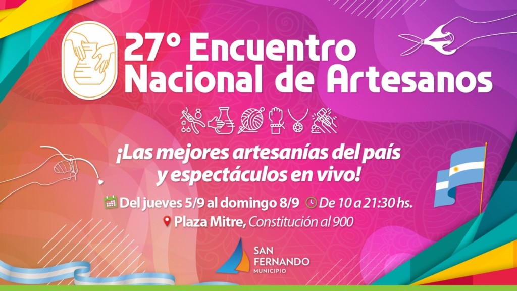 Del jueves 5 hasta el domingo 8 de septiembre, de 10 a 21.30 horas en la céntrica Plaza Mitre de San Fernando, se realizará el 27° Encuentro Nacional de Artesanos, donde habrá stands en los que se mostrarán las mejores artesanías del país, además de espectáculos culturales para toda la familia.
